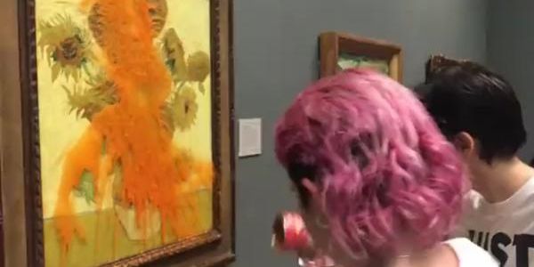 Dos mujeres activistas del grupo Just Stop Oil contra el cambio climático arrojaron sopa de tomate sobre el famoso cuadro Los girasoles, de Vincent van Gogh, el cual se expone en la Galería Nacional de Londres.