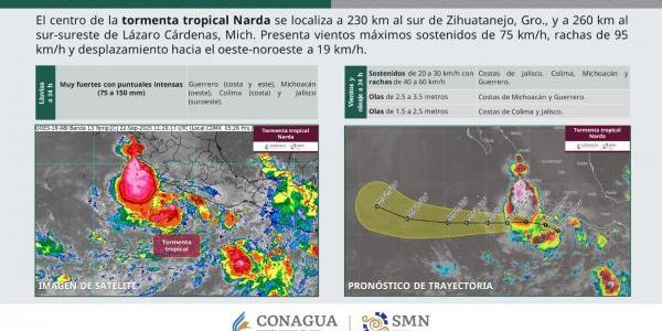 La tormenta tropical Narda ocasionará lluvias puntuales intensas, rachas fuertes de viento y oleaje elevado en Jalisco, Colima, Michoacán y Guerrero.