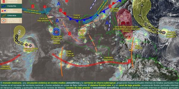 Para hoy, el monzón mexicano y una circulación ciclónica en niveles medios de la atmósfera, sobre el sur del golfo de California, así como la corriente en chorro subtropical, propiciarán lluvias puntuales intensas en Sinaloa; puntuales muy fuertes en Baja California Sur, Nayarit, Durango, Chihuahua y Sonora; y lluvias aisladas en zonas de Baja California.