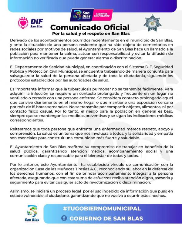 Por lo anterior y tras llegar a oídos del presidente municipal de San Blas, José Antonio Barajas López, informó mediante un comunicado que reprueba rotundamente este cruel acto de discriminación e hizo un llamado a la población a mantener la calma, además de dejar en claro que su gobierno, en conjunto con el Departamento de Sanidad Municipal, el sistema del DIF, Seguridad Pública y Protección Civil Municipal se encuentran trabajando para salvaguardar la integridad de la persona afectada.