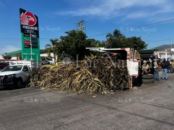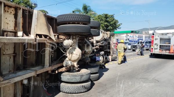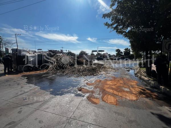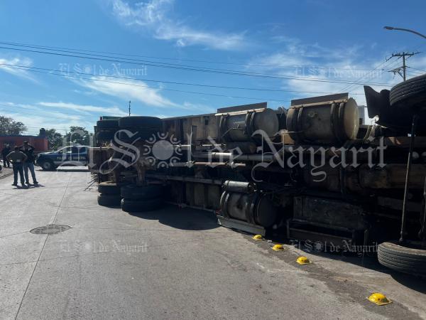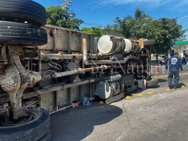 Se trata de un camión cañero de la marca Kenworth en color blanco, el cual al intentar incorporarse hacia la avenida Aguamilpa y a la alta velocidad, cedió debido al peso de la carga y terminó volcando sobre su costado izquierdo.