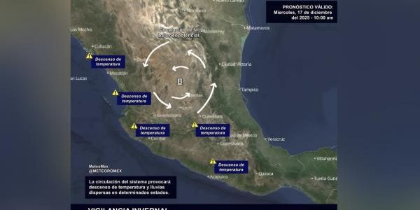 Para el occidente del país, se estiman temperaturas mínimas entre 10 y 15 °C en promedio, mientras que en zonas costeras podrían oscilar entre 15 y 20 °C, excepto en el estado de Guerrero, donde se prevén valores más elevados.
