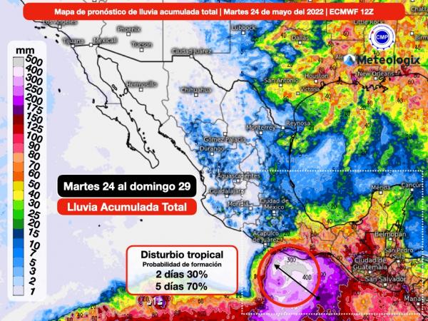 Se espera un aumento de chubascos y tormentas fuertes dispersas con posibilidad de granizadas en sierras y valles de Nayarit, Sinaloa, (sur), Durango, Zacatecas, Jalisco, Colima, Michoacán, Guerrero., Aguascalientes, Guanajuato, Qro, SLP, Hidalgo, Tlaxcala, Mor, Edo. Méx., CDMX, Puebla, y Veracruz...
