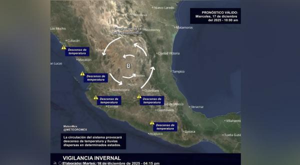 La circulación de una baja presión en altura provocará temperaturas frías a muy frías en México. Esta tarde, mediante el análisis meteorológico, se observa el desarrollo continuo de una baja geopotencial asociada a una vaguada polar sobre el norte del territorio mexicano. El análisis ...