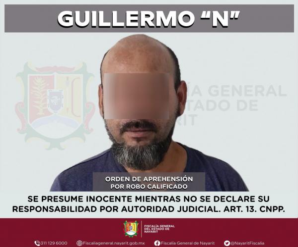 La FiscalÃa General del estado de Nayarit informa que elementos de la Agencia de Investigación Criminal ejecutaron una orden de aprehensión contra Guillermo N. Lo anterior por su probable participación en hechos que la ley tipifica como delito de robo calificado, cometido en agravio de una pe...