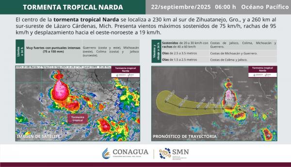 La tormenta tropical Narda ocasionará lluvias puntuales intensas, rachas fuertes de viento y oleaje elevado en Jalisco, Colima, Michoacán y Guerrero. A 230 km al sur de Zihuatanejo, Gro., y a 260 km al sur-sureste de Lázaro Cárdenas, Mich. Chubascos con lluvias puntuales fuertes (25 a 50 mm):...